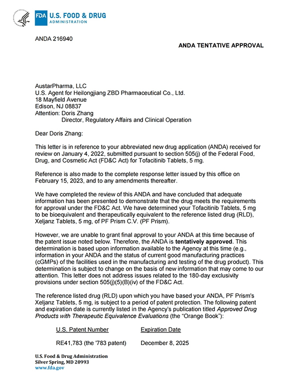 5月26日,珍寶島藥業(yè)發(fā)布公告,公司收到美國食品藥品監(jiān)督管理局(簡稱“美國FDA”)的通知,珍寶島藥業(yè)向美國FDA申報的枸櫞酸托法替布片的新藥簡略申請(ANDA,即美國仿制藥申請)已獲得暫時批準(暫時批準:指FDA已經(jīng)完成仿制藥的所有審評要求,但由于專利權(quán)或?qū)Yu權(quán)未到期而給予的一種批準形式)。